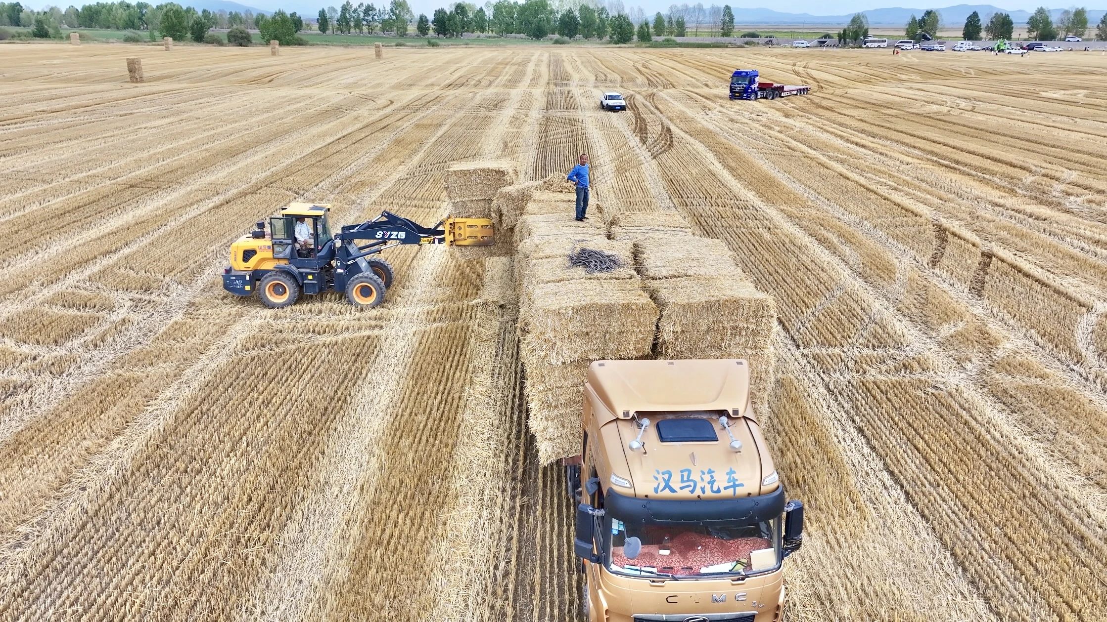 收割过后,麦田里整齐堆放的麦草垛也孕育着新的经济增长点。昭苏马场种植户梁延兵今年种植的2000亩小麦喜获丰收,平均亩产达到450公斤。“趁着眼下天气不错,我们组织多台联合收割机机械化作业。麦收后的秸秆直接由收购商在田间打捆回收,这样既解决了秸秆处理难题,又为我增加了一笔额外收入,实现了粮食和秸秆双丰收,让‘绿色资源’变成‘金色效益’。”梁延兵说。