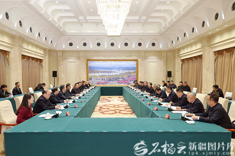 11月20日,自治区党委书记陈小江、自治区主席艾尔肯·吐尼亚孜在乌鲁木齐会见水利部党组书记、部长李国英一行。石榴云/新疆日报记者 崔志坚 摄