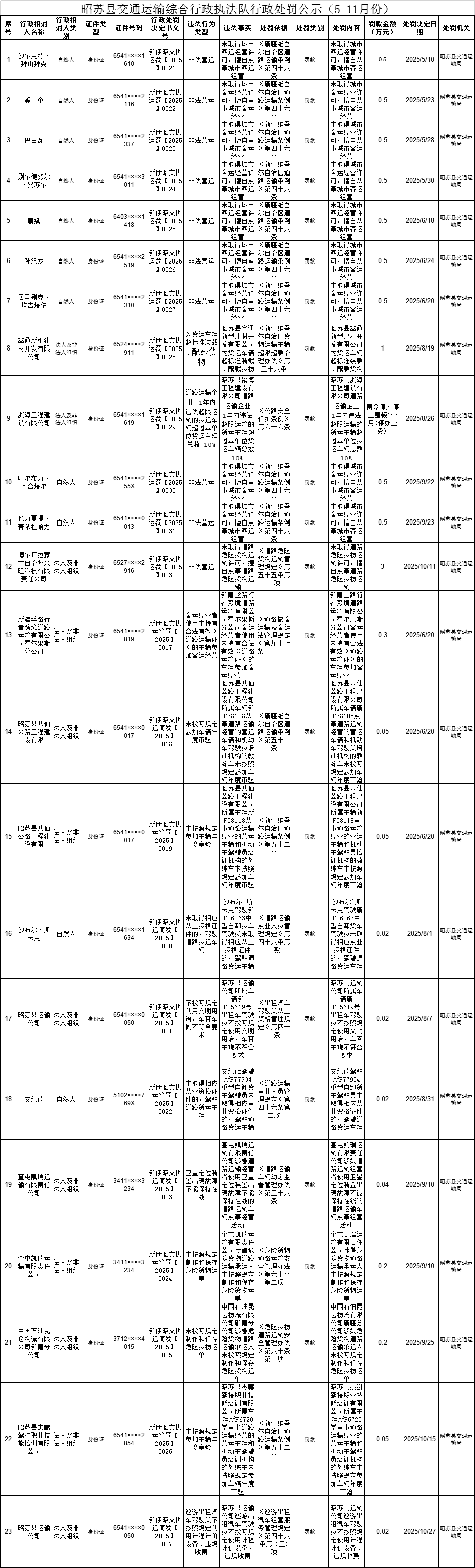 昭苏县交通运输综合行政执法队行政处罚公示(5-11月份)