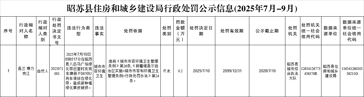 昭苏县住房和城乡建设局行政处罚公示信息(2025年7月-9月)