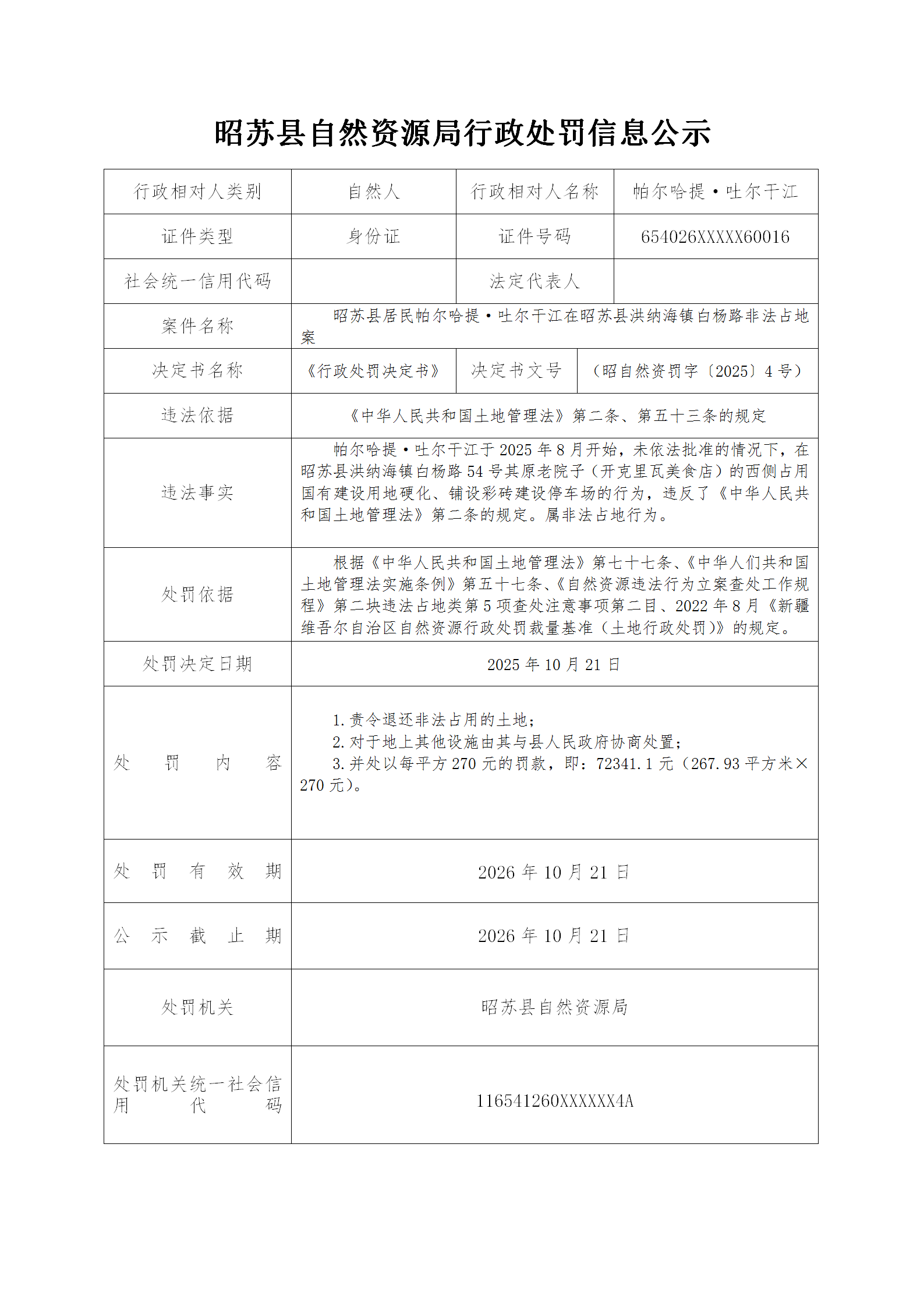 昭苏县自然资源局行政处罚信息公示