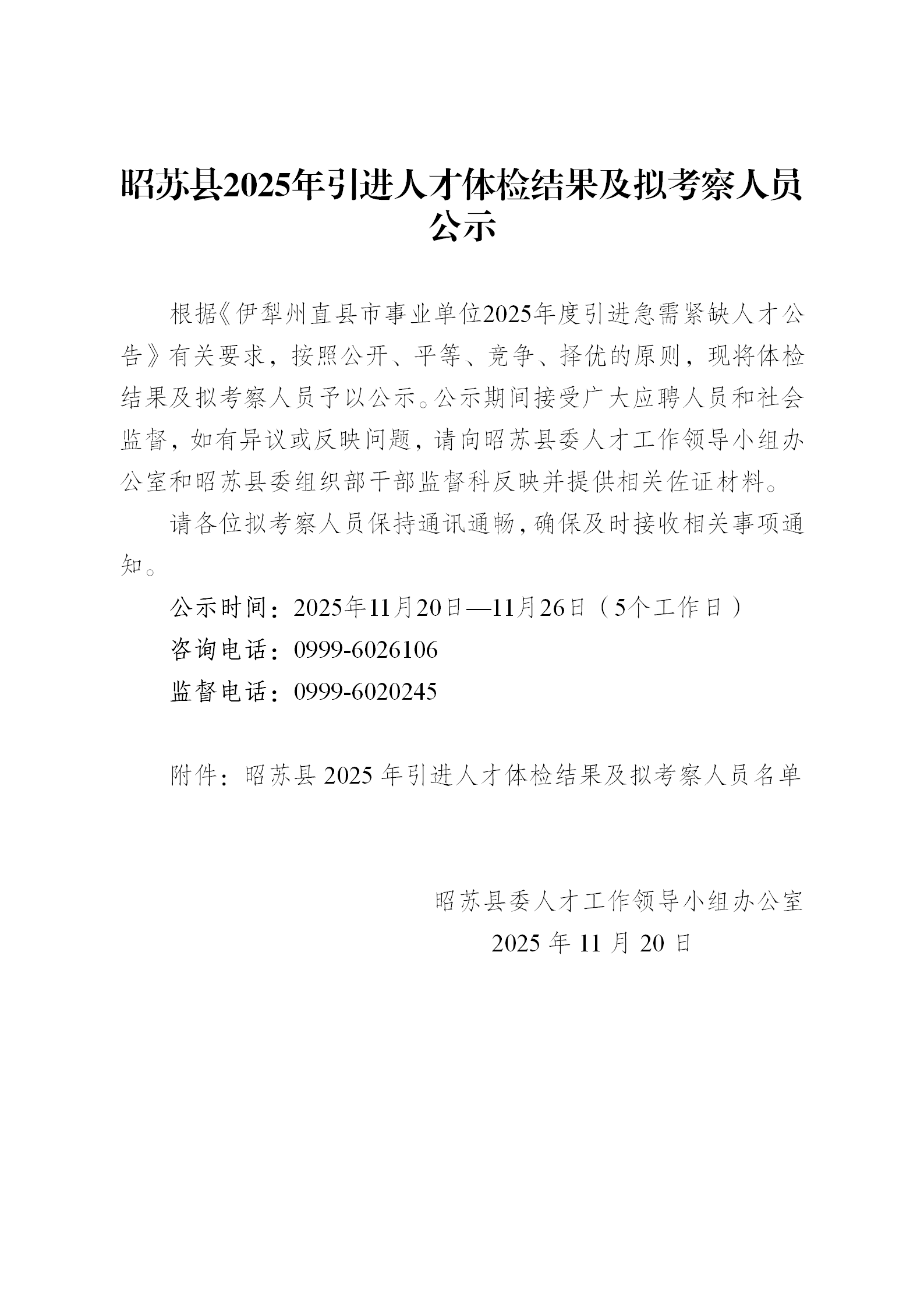 昭苏县2025年引进人才体检结果及拟考察人员公示
