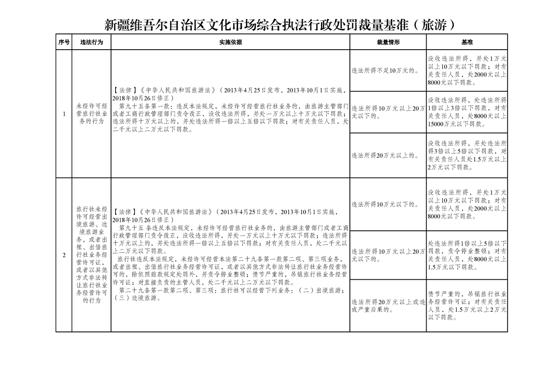 新疆维吾尔自治区文化市场综合执法行政处罚裁量基准(旅游)