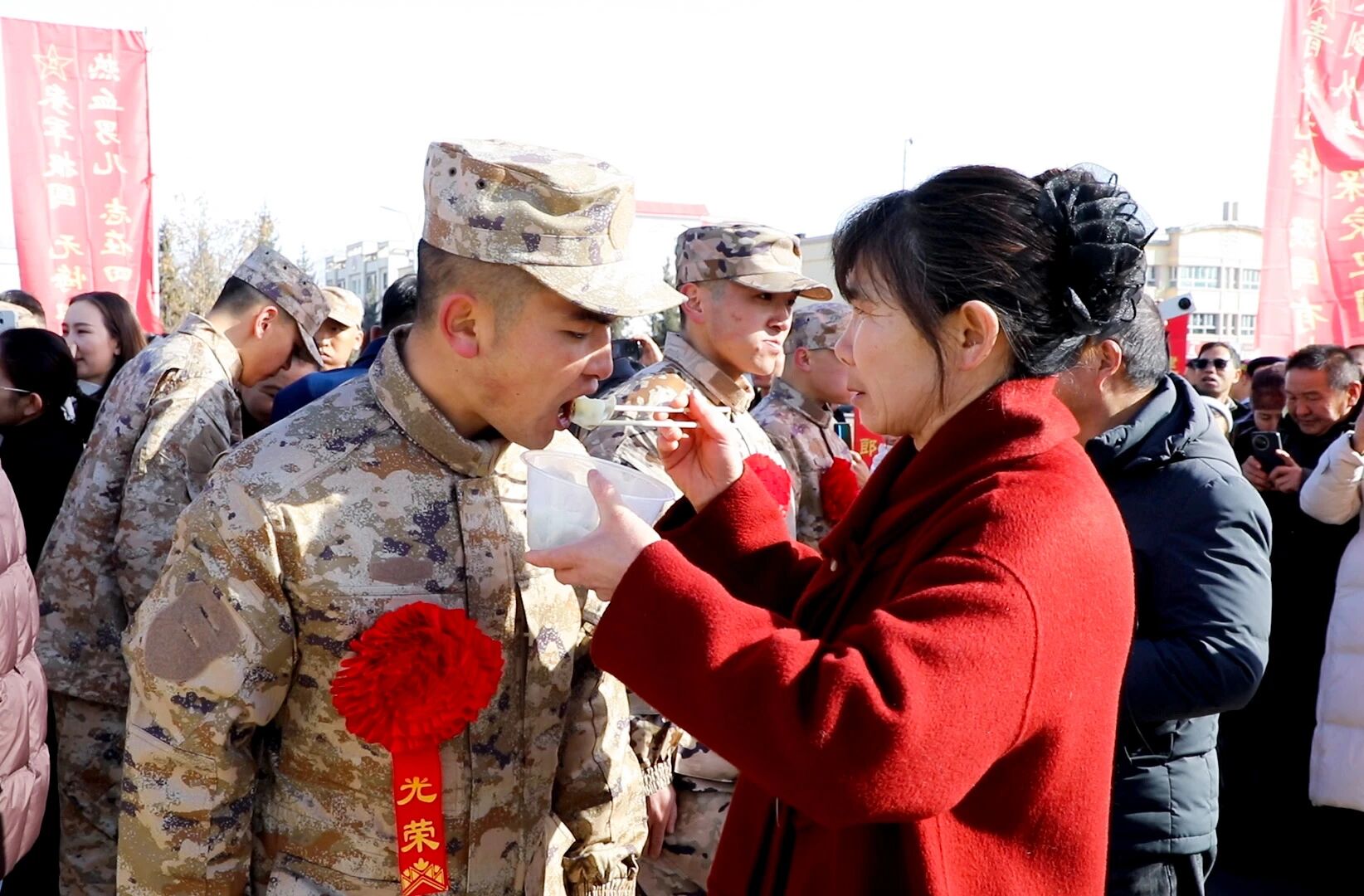 仪式伊始,现场温情涌动。新兵们与家长合影留念,定格下出征前的珍贵瞬间。家长们亲手为即将远行的孩子端上热气腾腾的出征饺,一个个饱满的饺子,承载着阖家的牵挂与期许,为即将开启的军旅生涯送上最温暖的祝福。