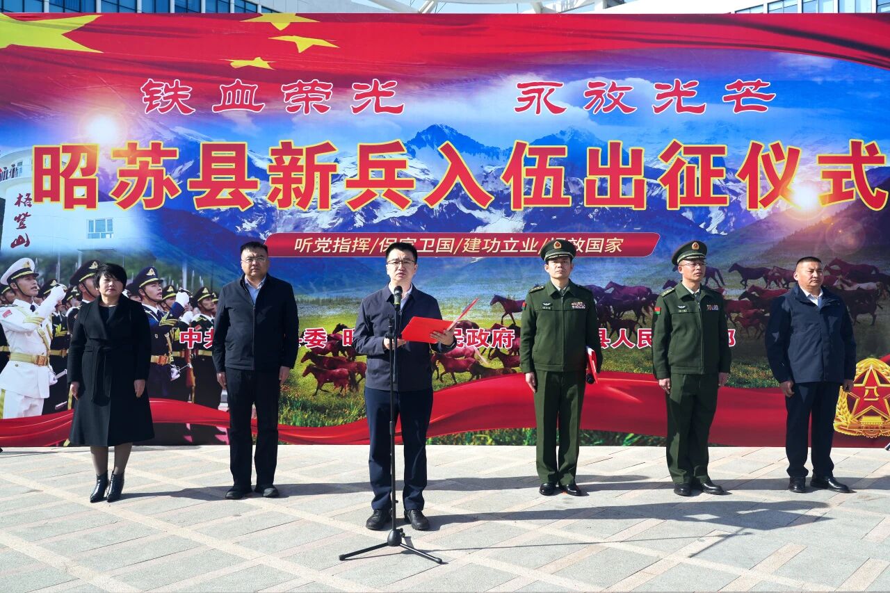 新兵代表吾拉哈提·开衣拉特别克说:“今天参加昭苏县新兵入伍出征仪式,我感到无比光荣与自豪,感谢家乡的培养与亲人的支持,我一定牢记嘱托,到部队后刻苦训练、锤炼本领,努力成为一名合格军人,绝不辜负昭苏父老乡亲的期望。”