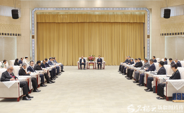 9月18日,自治区党委书记陈小江、自治区主席艾尔肯·吐尼亚孜在乌鲁木齐会见巴基斯坦总统扎尔达里一行。石榴云/新疆日报记者崔志坚摄
