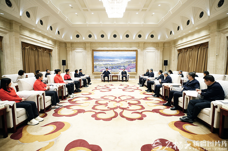 1月29日,自治区党委书记陈小江,自治区党委副书记、自治区主席艾尔肯·吐尼亚孜会见国家体育总局局长、党组书记高志丹一行。石榴云/新疆日报记者 谢龙 摄