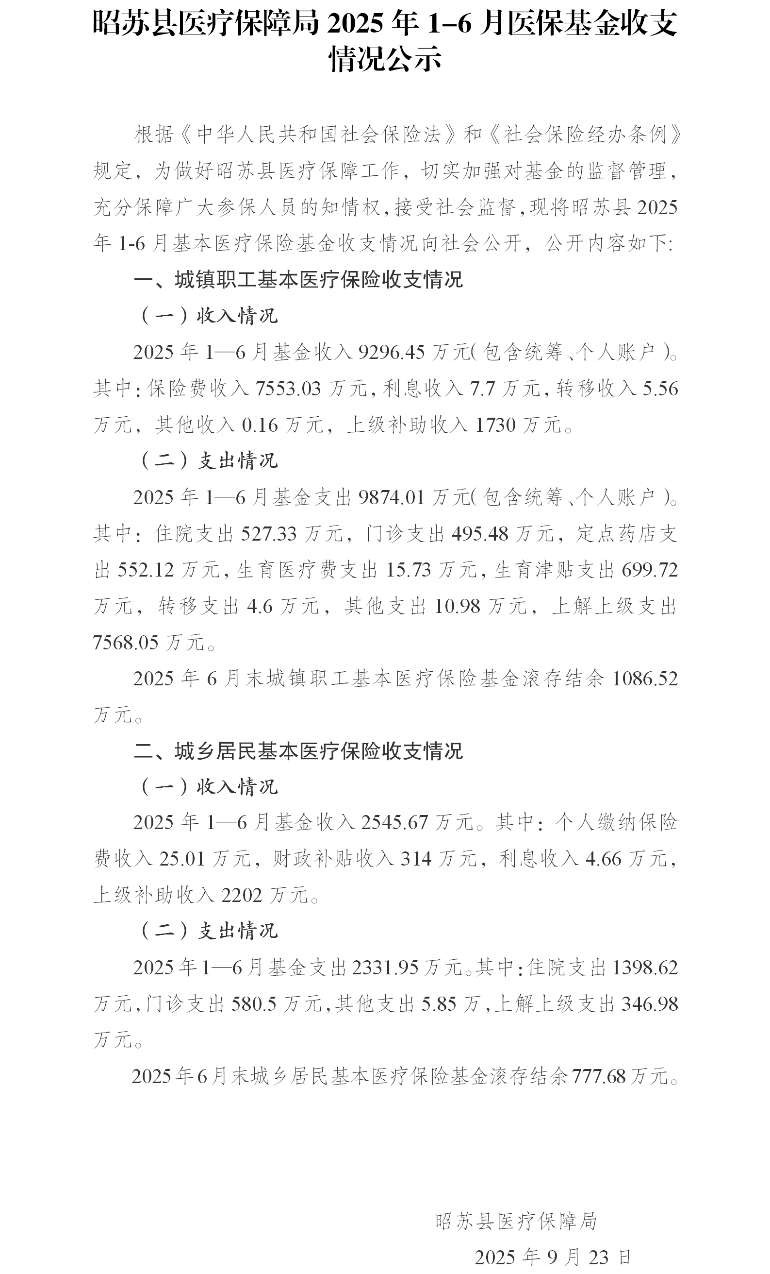 昭苏县医疗保障局2025年1-6月医保基金收支情况公示