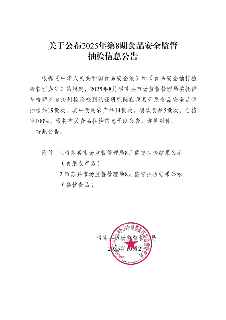 昭苏县市场监督管理局监督8月监督抽检结果公示(食用农产品合格).pdf