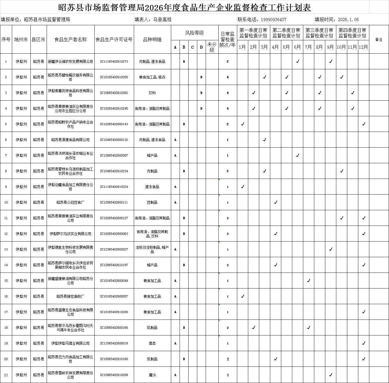 昭苏县市场监督管理局2026年度食品生产企业监督检查工作计划表