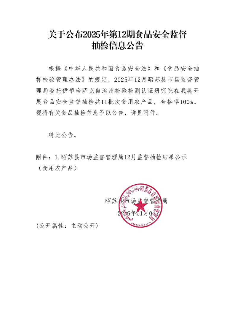 关于公布2025年第12期食品安全监督抽检信息公告