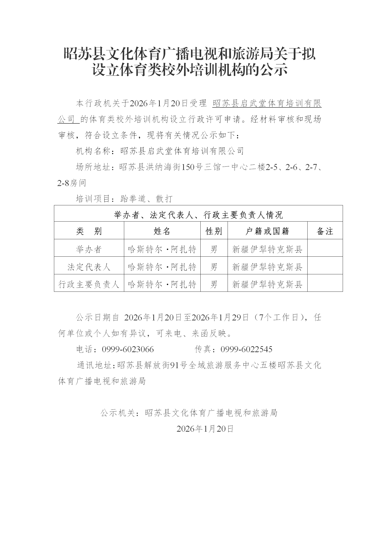 昭苏县文化体育广播电视和旅游局关于拟设立体育类校外培训机构的公示