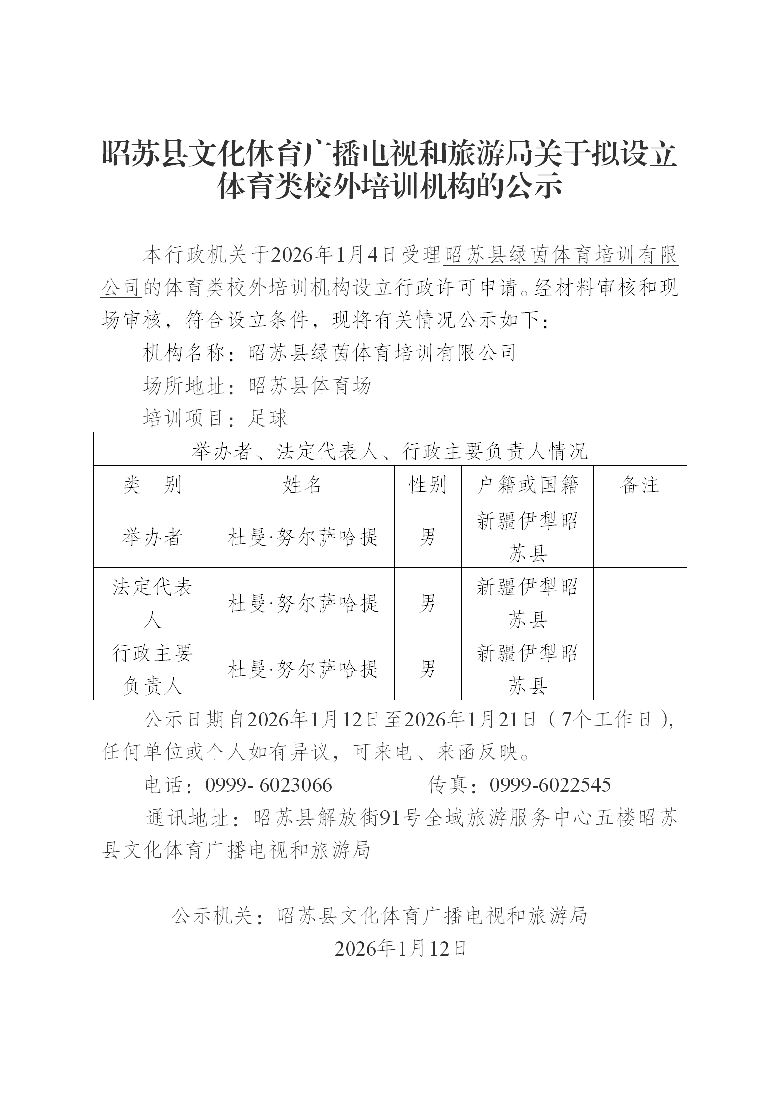 昭苏县文化体育广播电视和旅游局关于拟设立体育类校外培训机构的公示