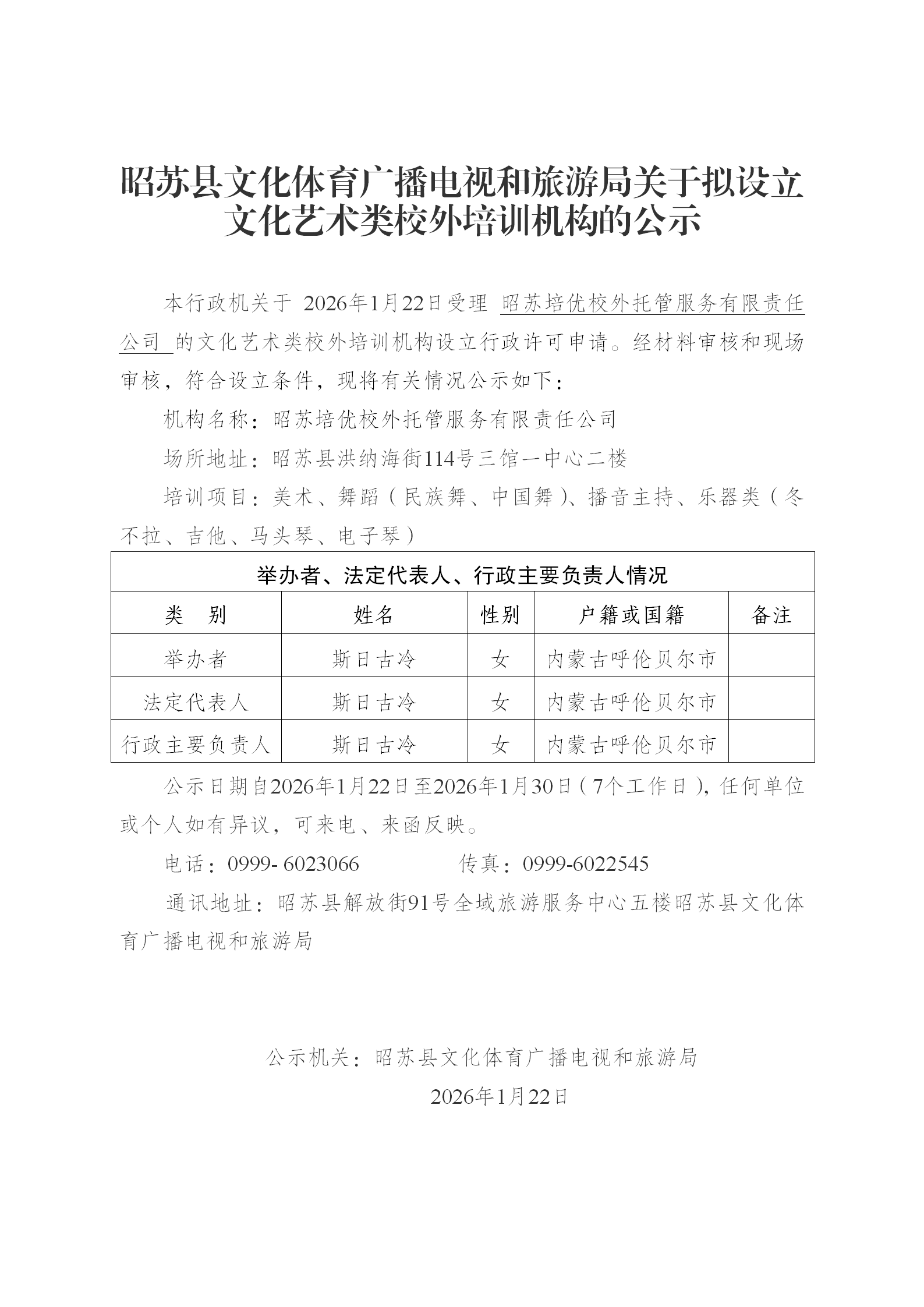 昭苏县文化体育广播电视和旅游局关于拟设立文化艺术类校外培训机构的公示