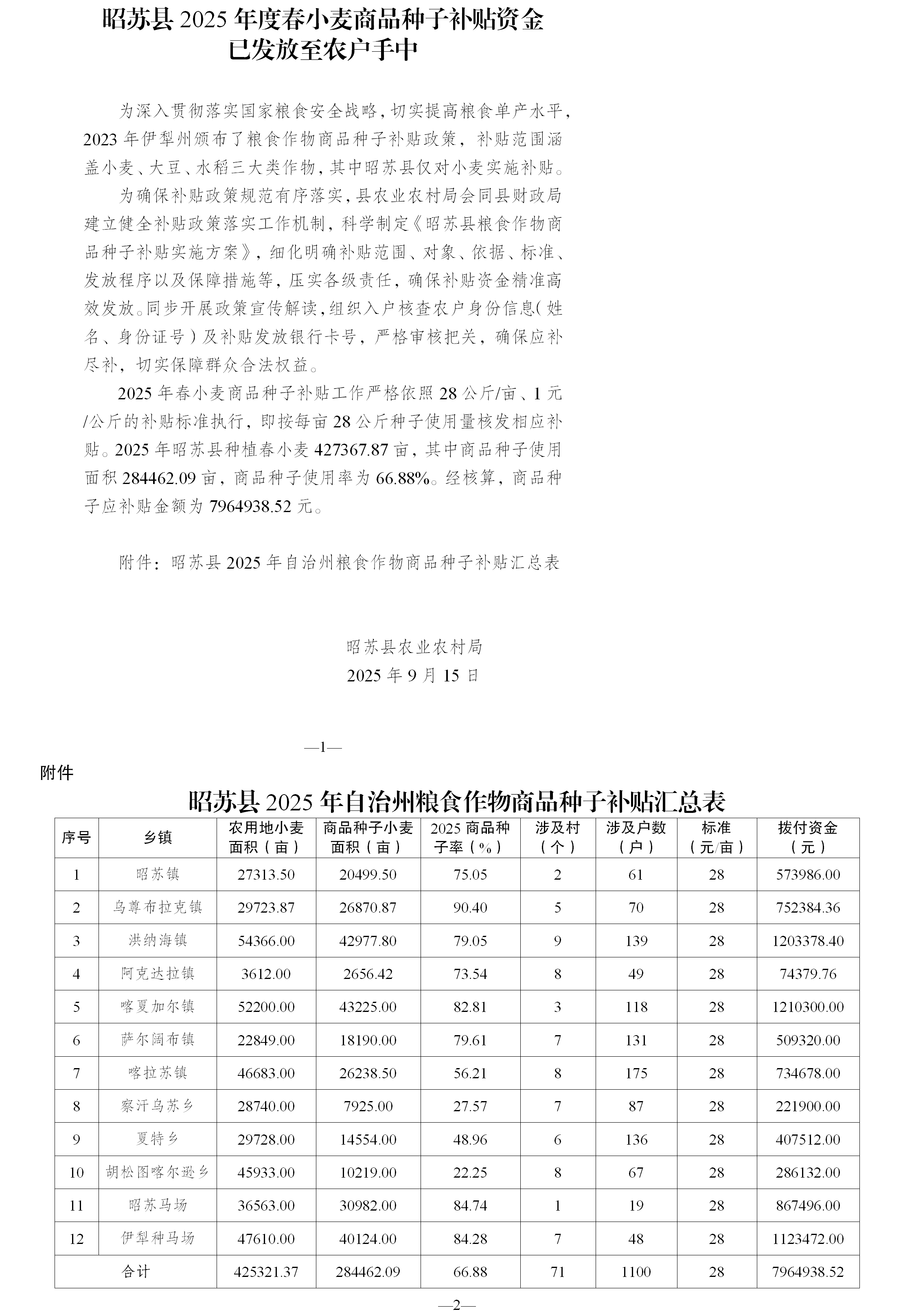 昭苏县2025年度春小麦商品种子补贴资金已发放至农户手中