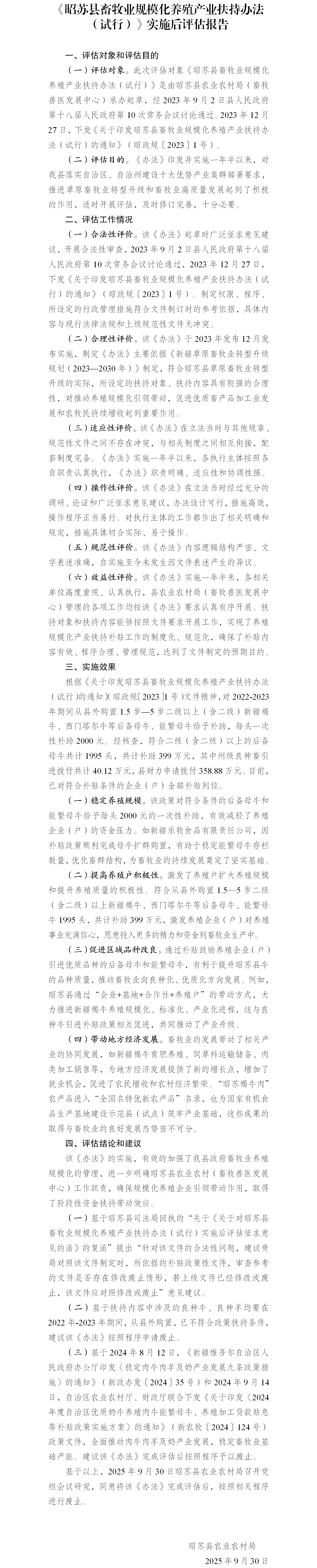 《昭苏县畜牧业规模化养殖产业扶持办法(试行)》实施后评估报告