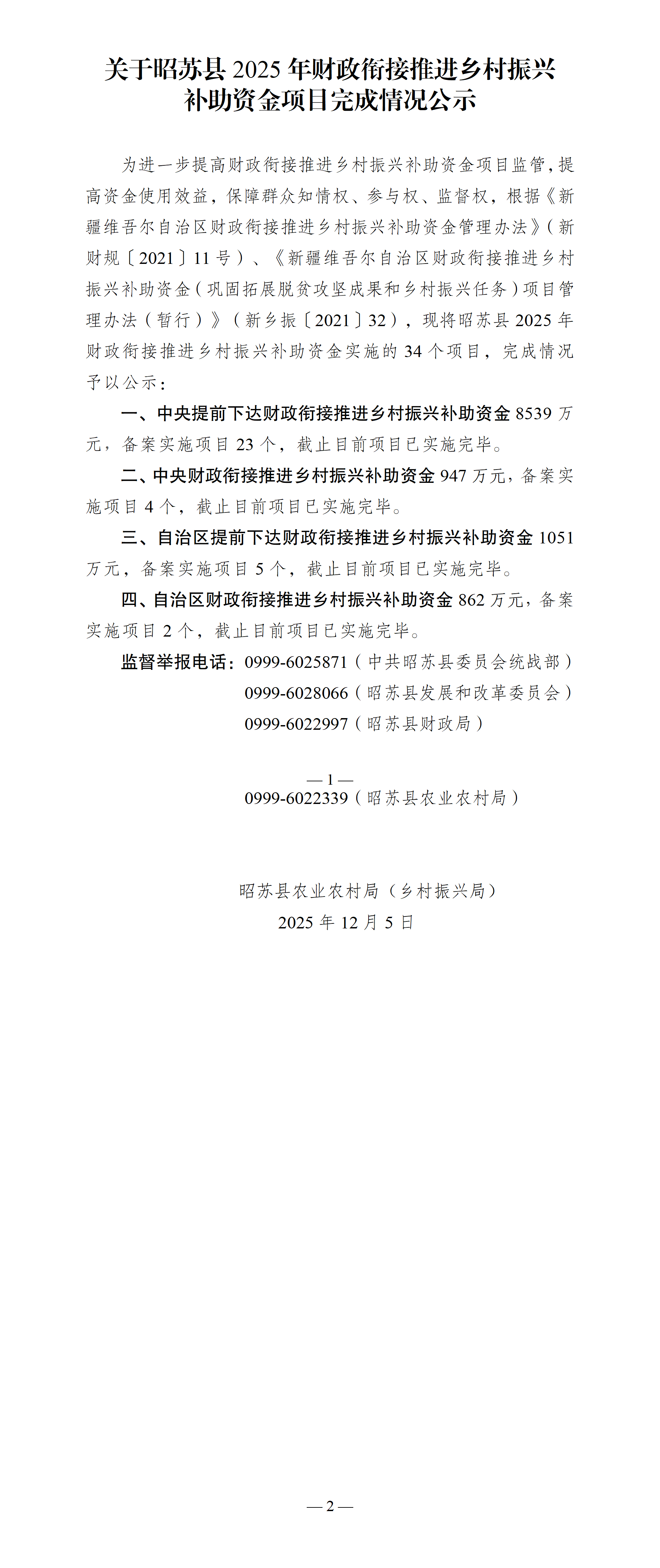 关于昭苏县2025年财政衔接推进乡村振兴补助资金项目完成情况公示