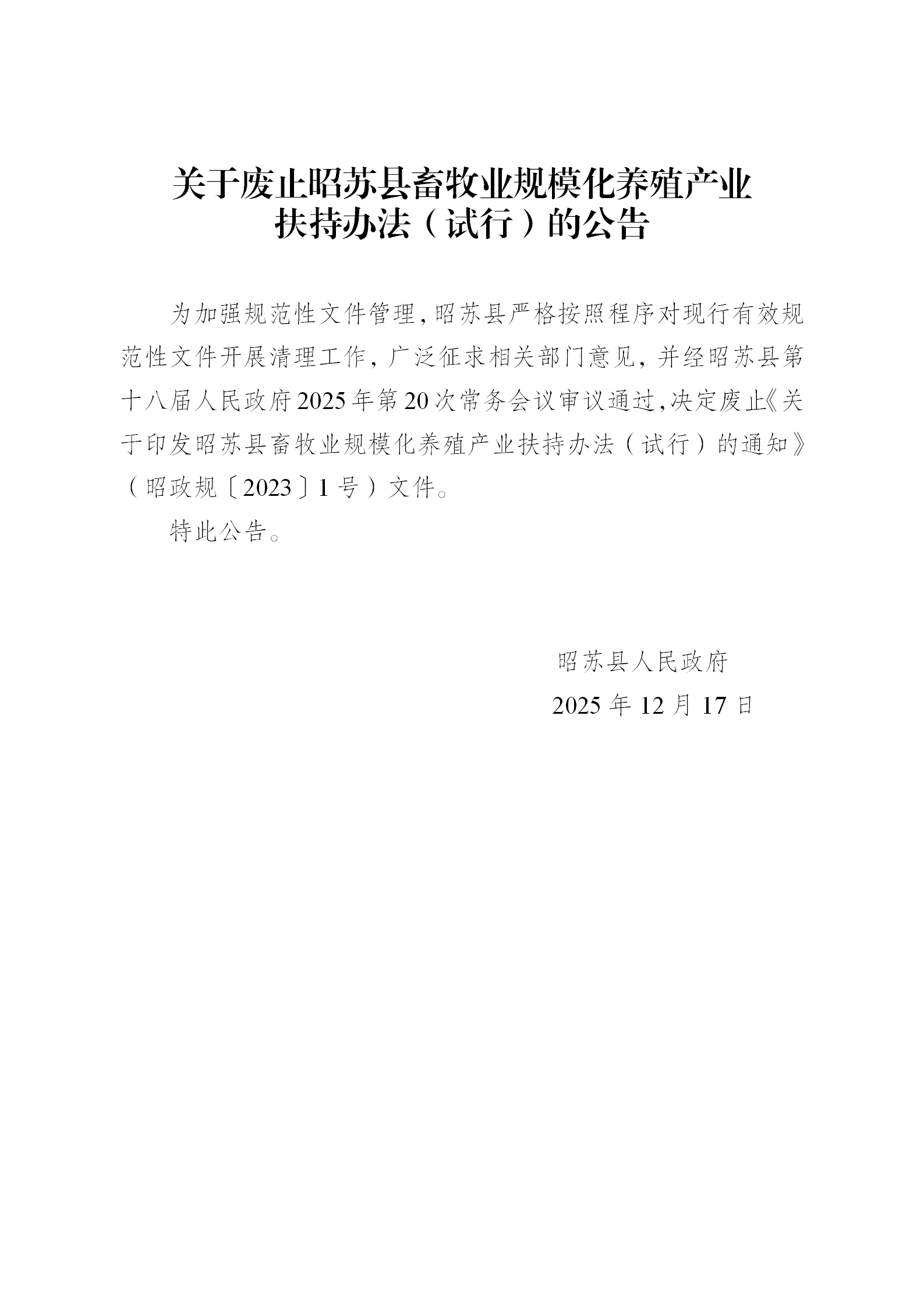 关于废止昭苏县畜牧业规模化养殖产业扶持办法(试行)的公告