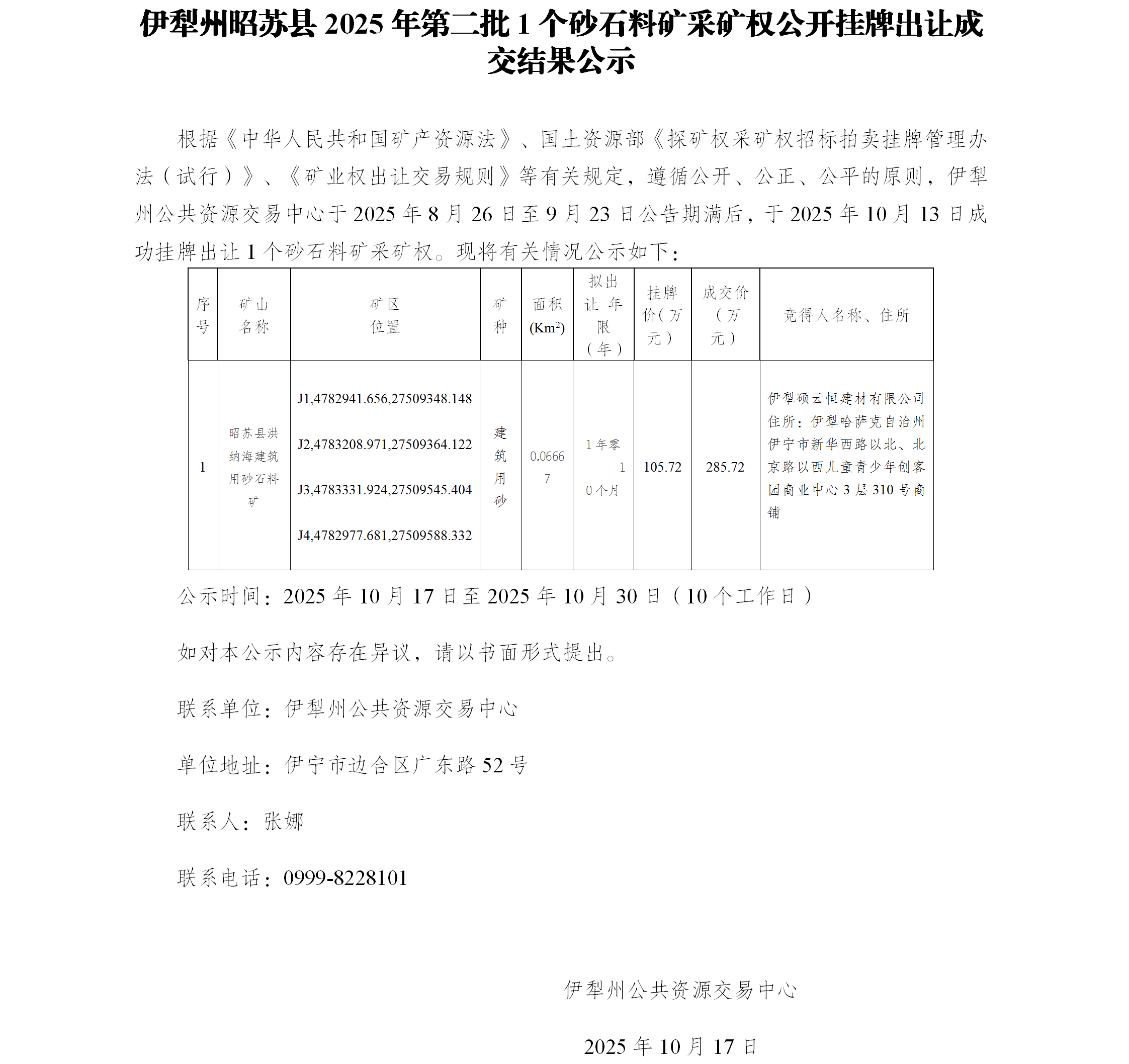 伊犁州昭苏县2025年第二批1个砂石料矿采矿权公开挂牌出让成交结果公示