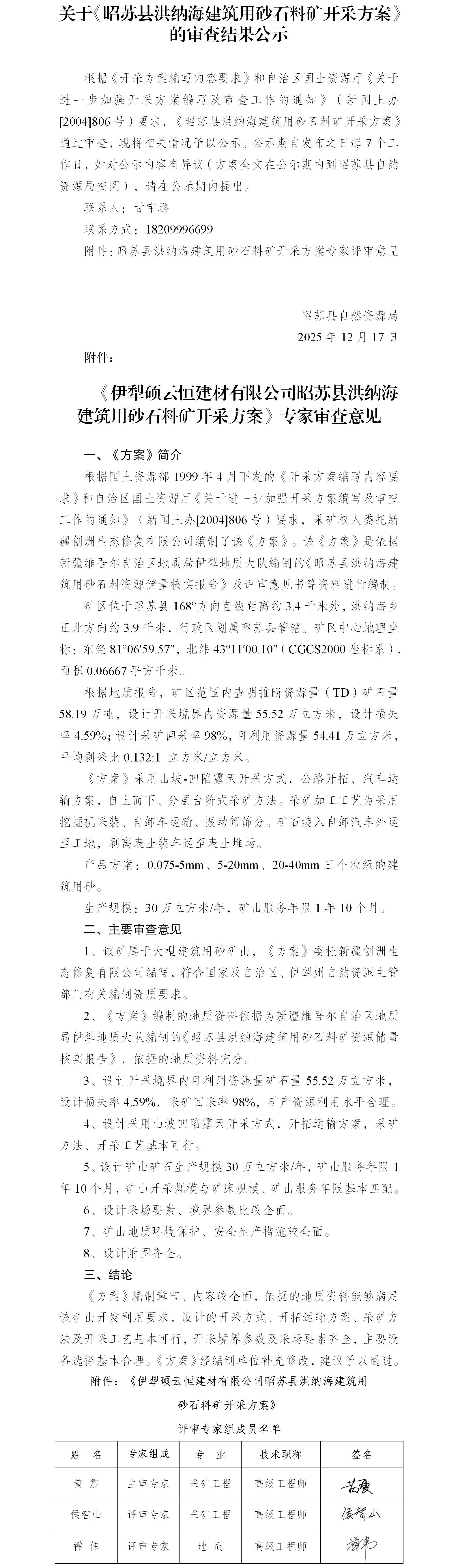 关于《昭苏县洪纳海建筑用砂石料矿开采方案》的审查结果公示