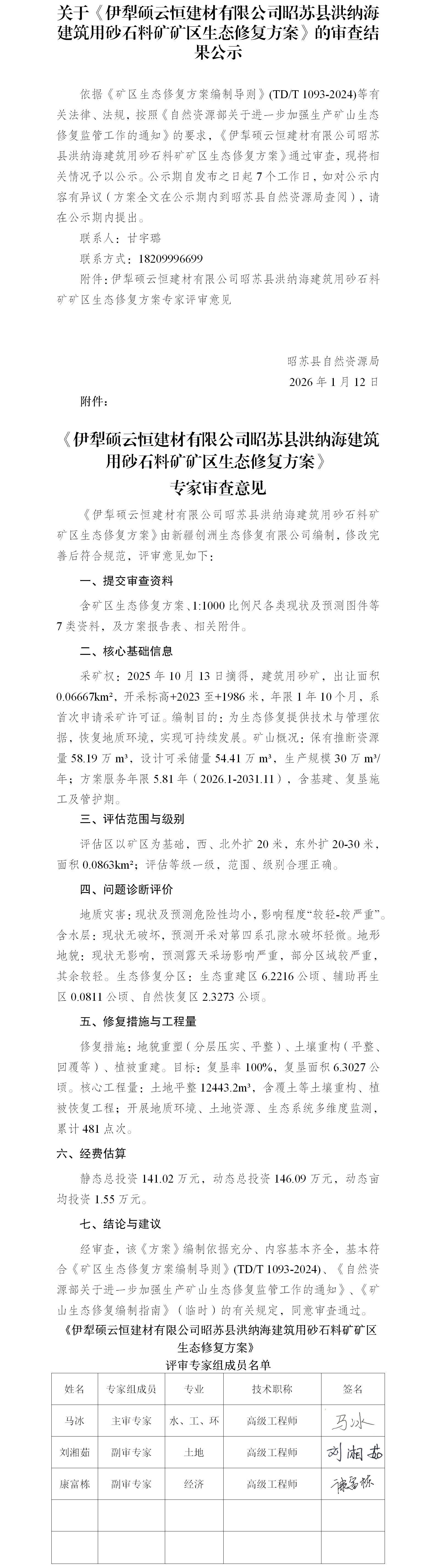 关于《伊犁硕云恒建材有限公司昭苏县洪纳海建筑用砂石料矿矿区生态修复方案》的审查结果公示