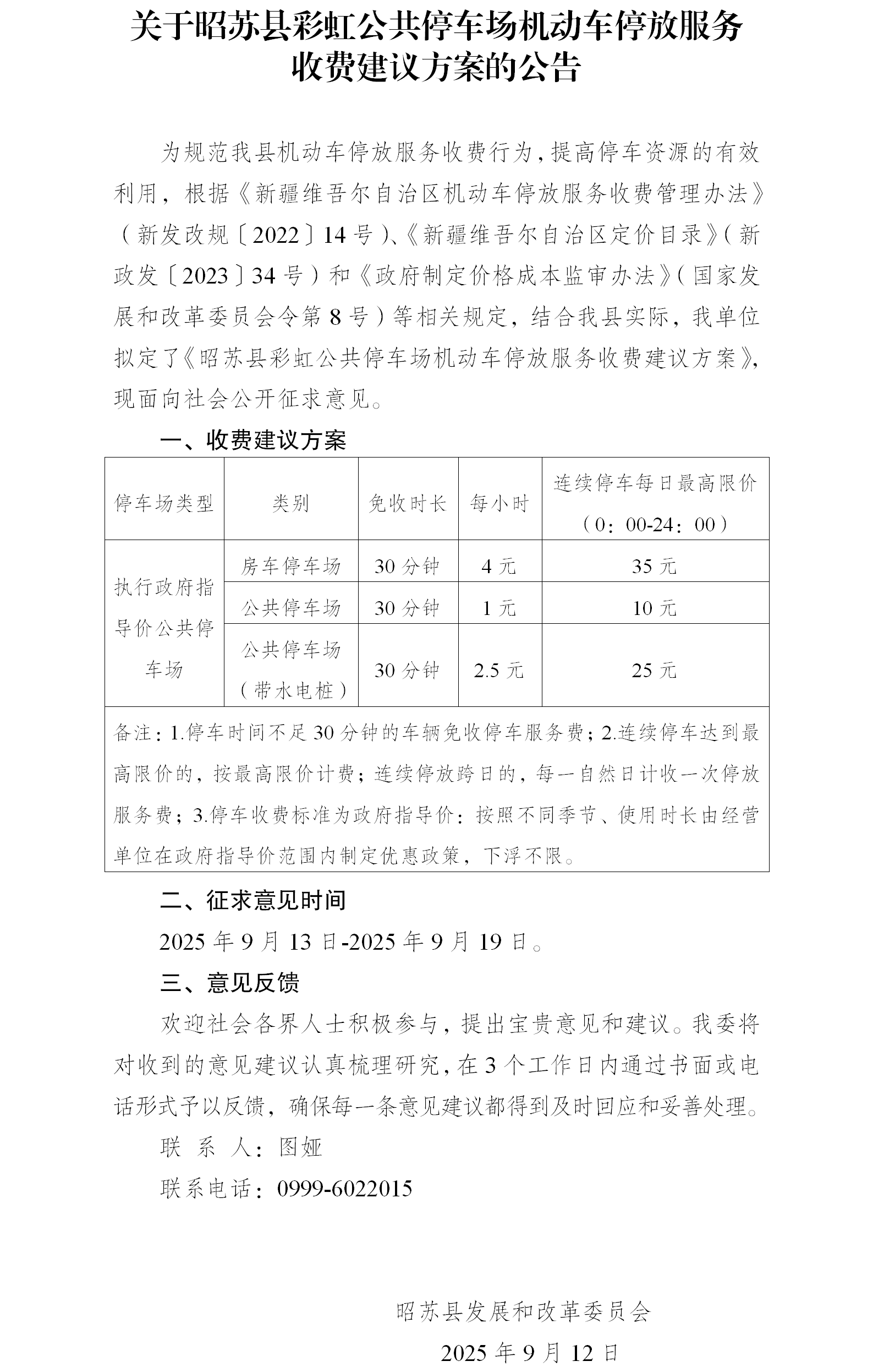 关于昭苏县彩虹公共停车场机动车停放服务收费建议方案的公告