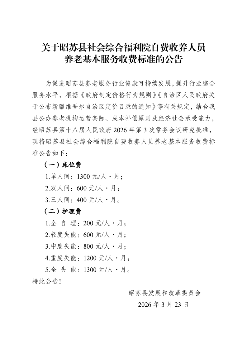 关于昭苏县社会综合福利院自费收养人员养老基本服务收费标准的公告