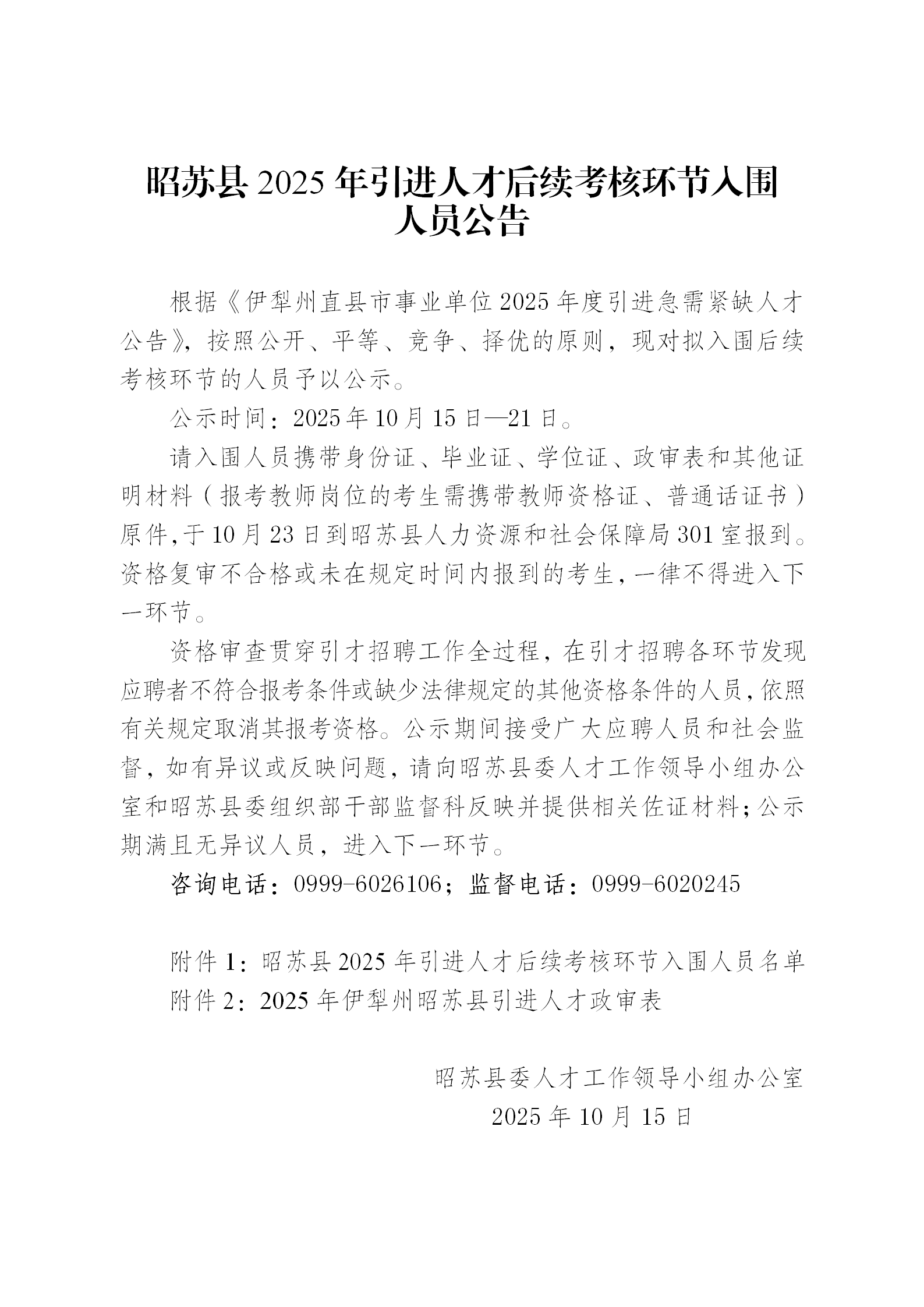 昭苏县2025年引进人才后续考核环节入围人员公告