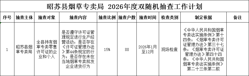 昭苏县烟草专卖局2026年度双随机抽查工作计划