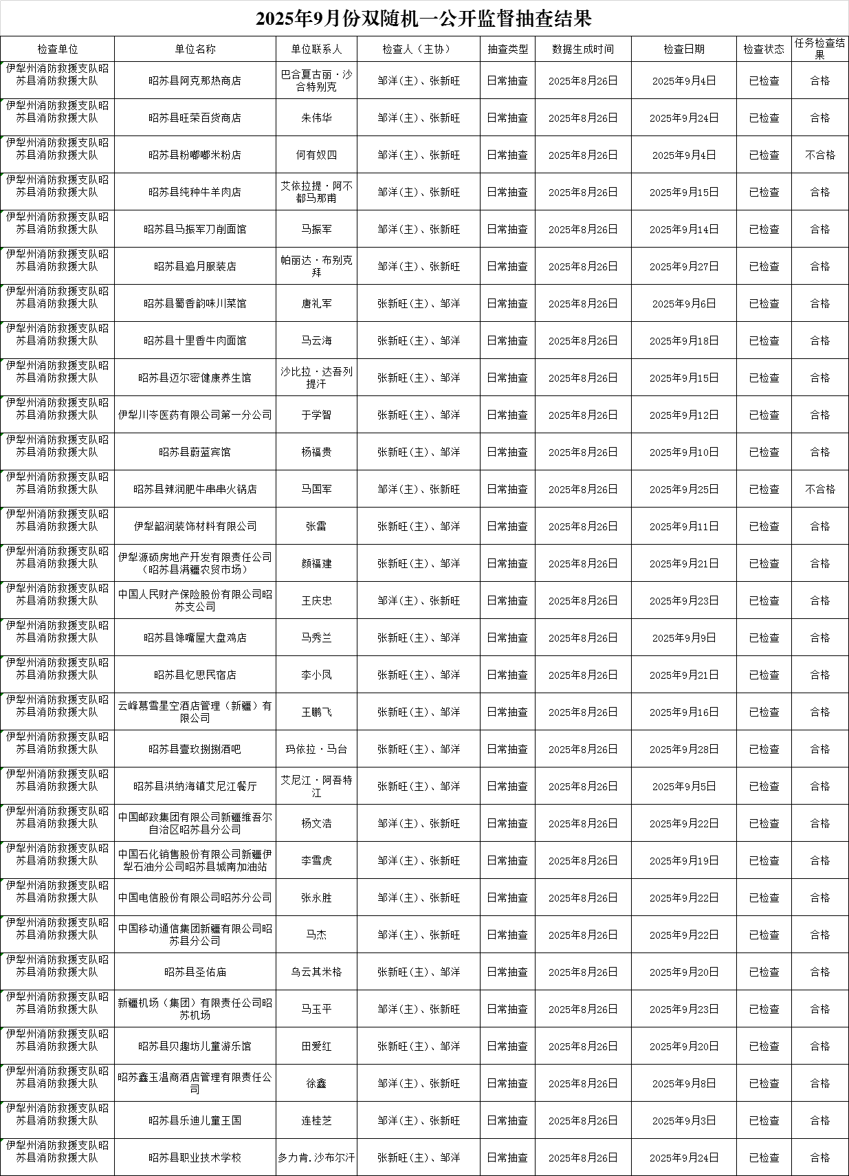 2025年9月份双随机一公开监督抽查结果