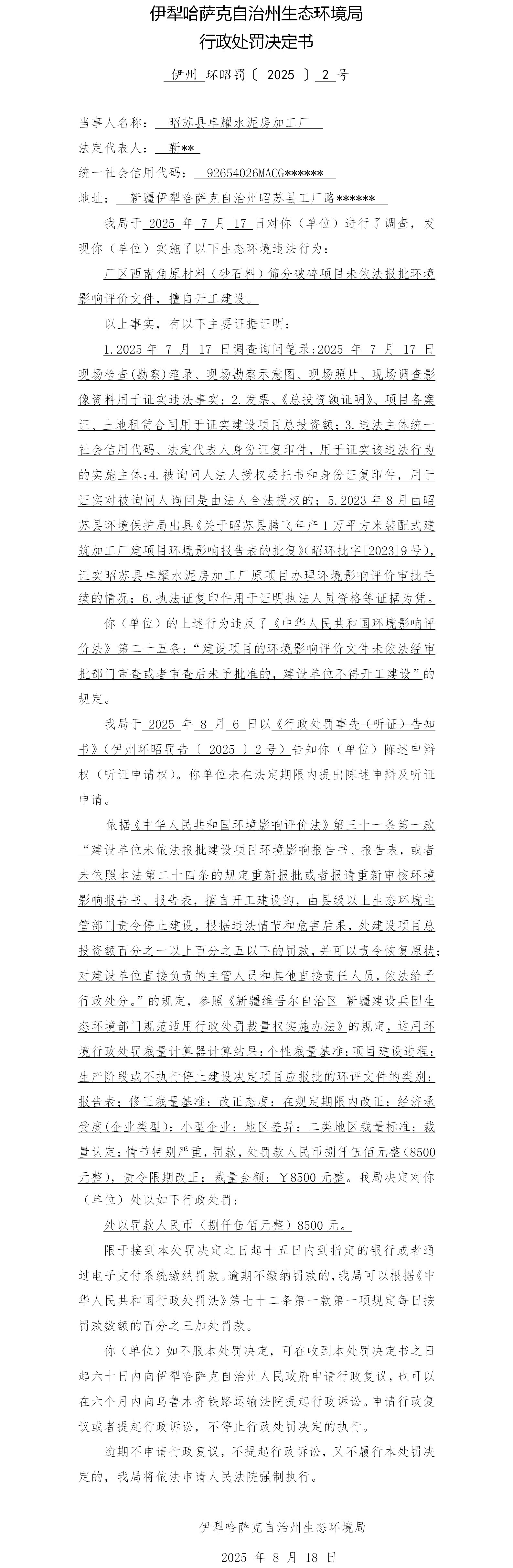 伊犁哈萨克自治州生态环境局行政处罚决定书