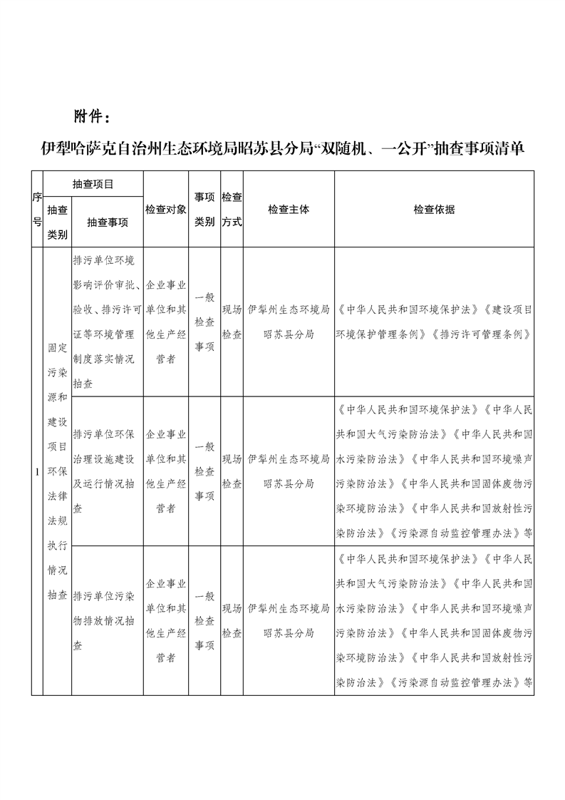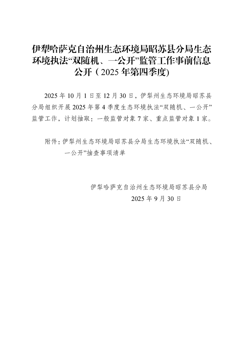 伊犁哈萨克自治州生态环境局昭苏县分局生态环境执法“双随机、一公开”监管工作事前信息公开(2025年第四季度)