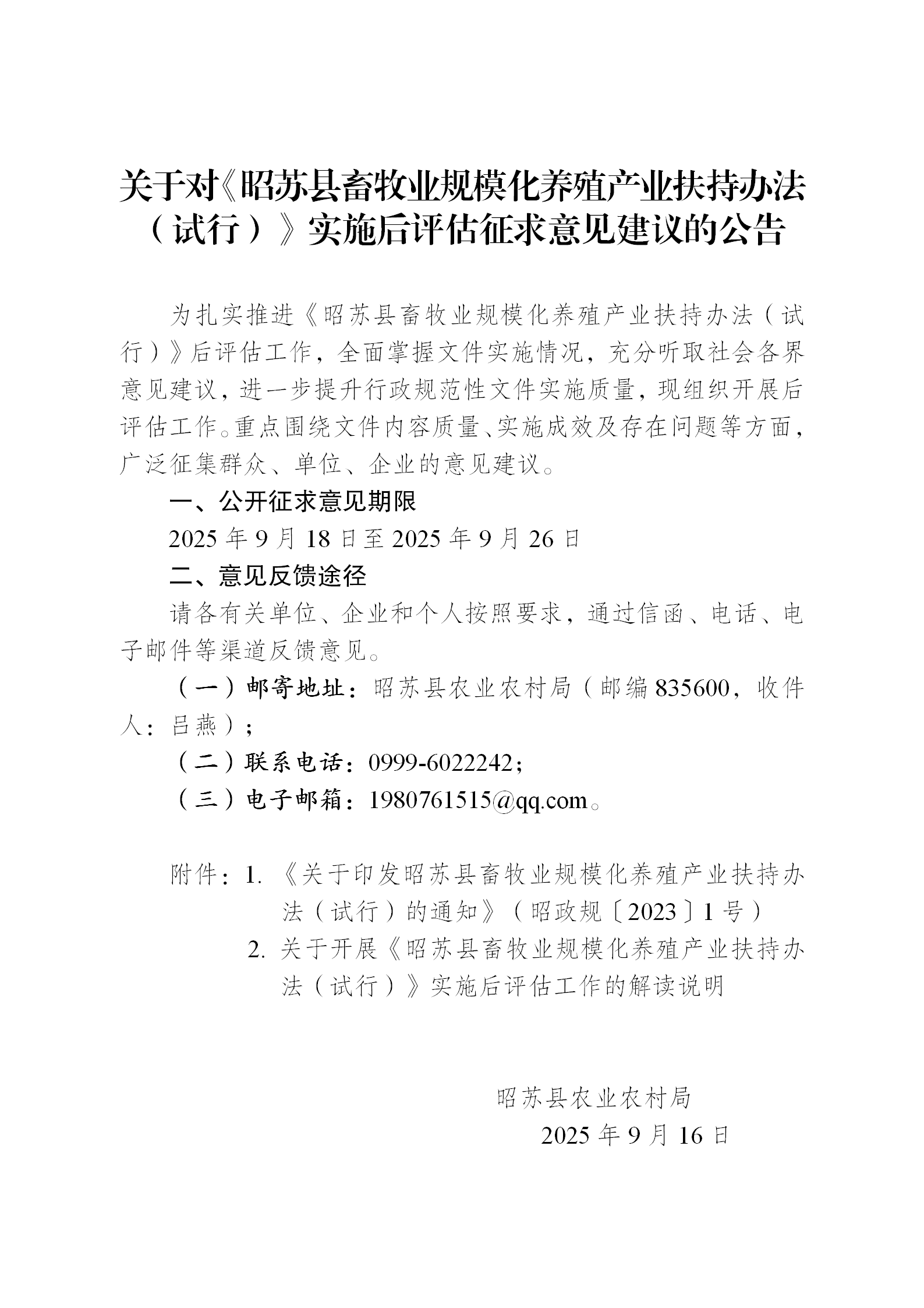 关于对《昭苏县畜牧业规模化养殖产业扶持办法(试行)》实施后评估征求意见建议的公告