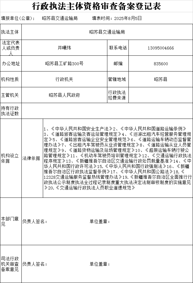 昭苏县交通运输局行政执法主体资格审查备案登记表