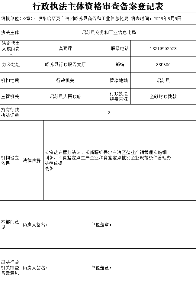 昭苏县商务和工业信息化局行政执法主体资格审查备案登记表