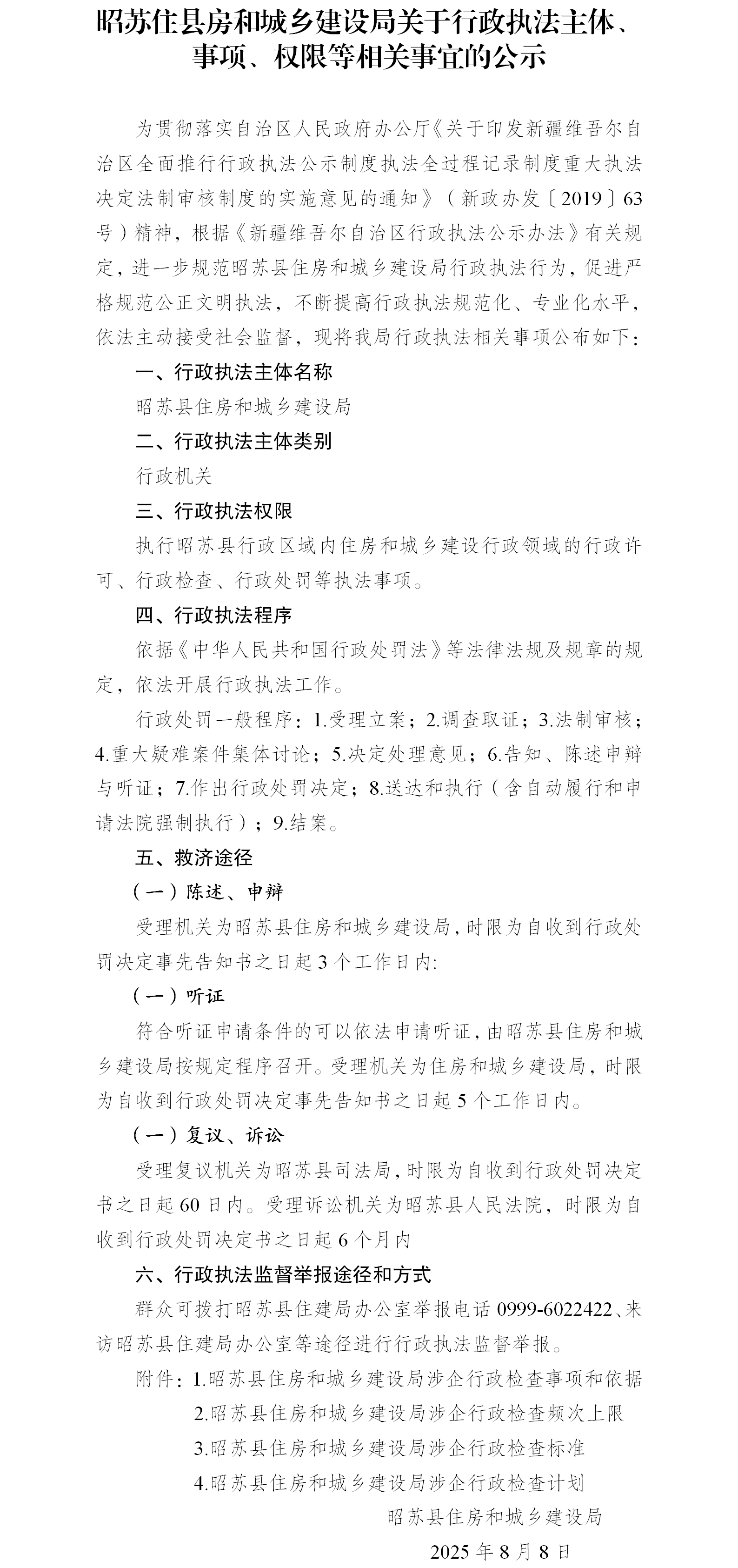 昭苏住县房和城乡建设局关于行政执法主体、事项、权限等相关事宜的公示