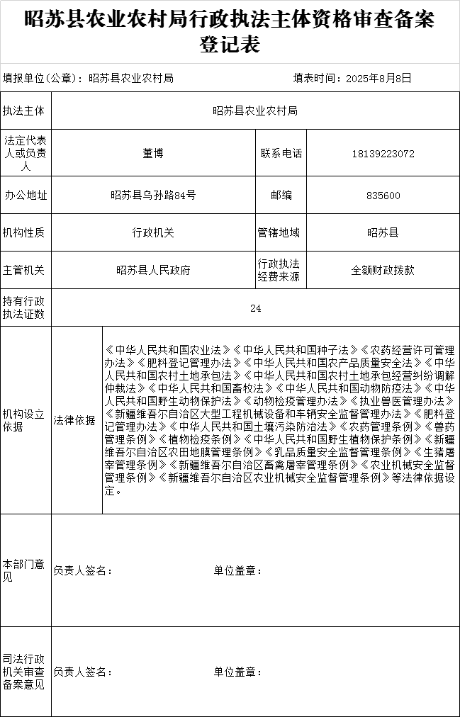 昭苏县农业农村局行政执法主体资格审查备案登记表