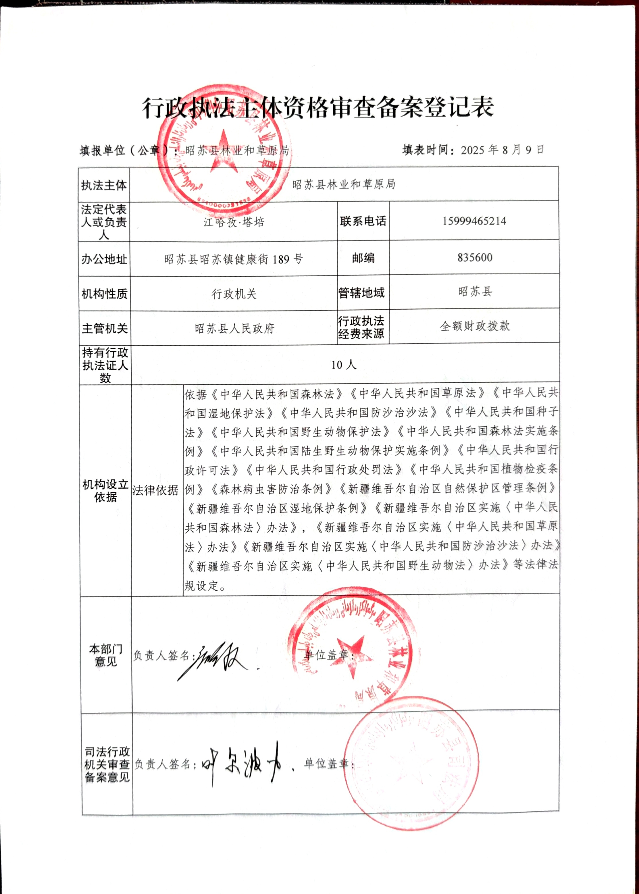 昭苏县林业和草原局行政执法主体资格审查备案登记表