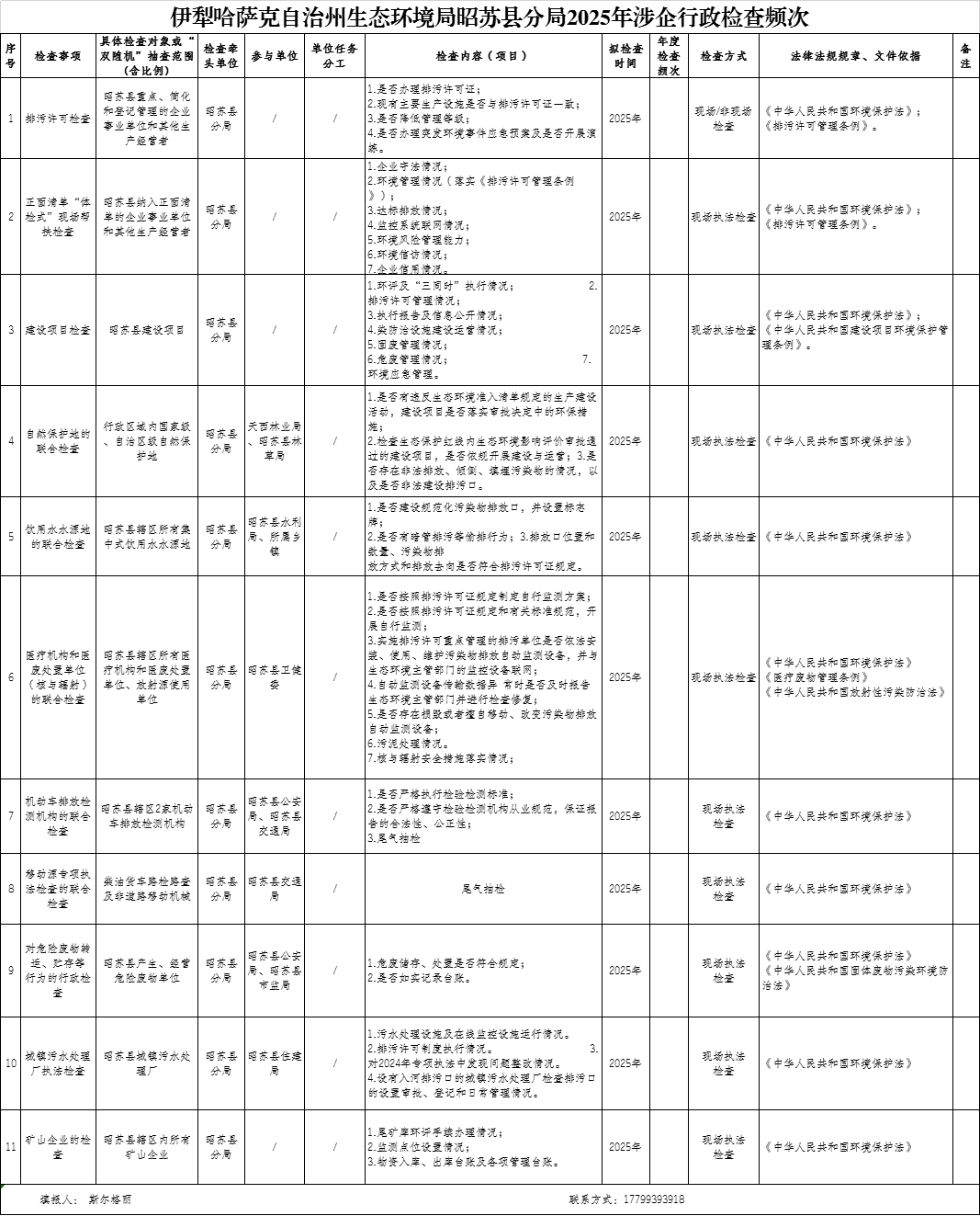 伊犁哈萨克自治州生态环境局昭苏县分局2025年涉企行政检查频次