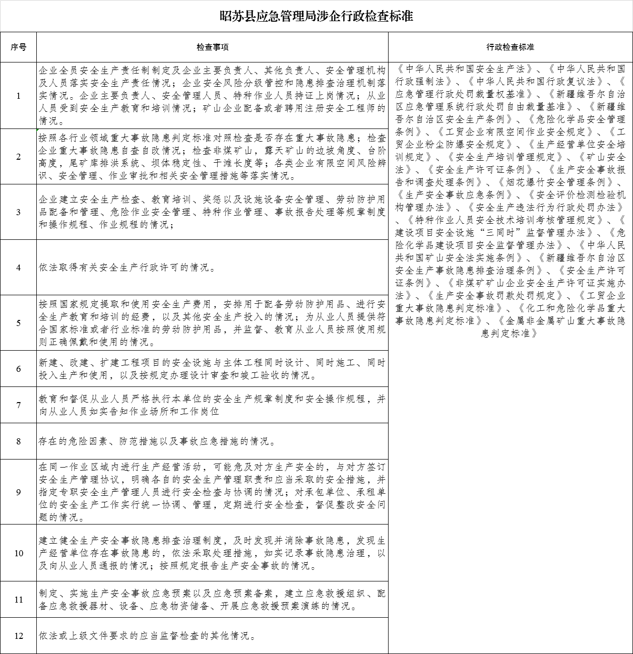 昭苏县应急管理局涉企行政检查标准