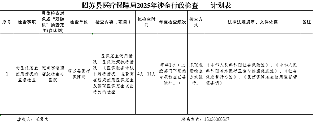 昭苏县医疗保障局2025年涉企行政检查---计划表