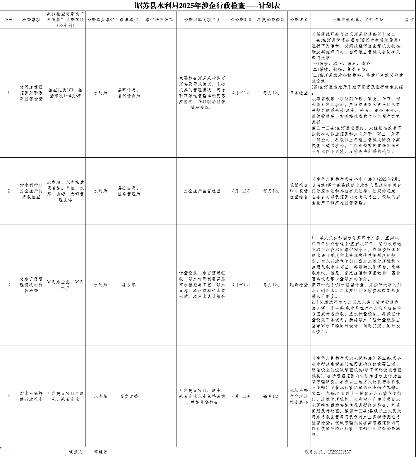 昭苏县水利局2025年涉企行政检查---计划表