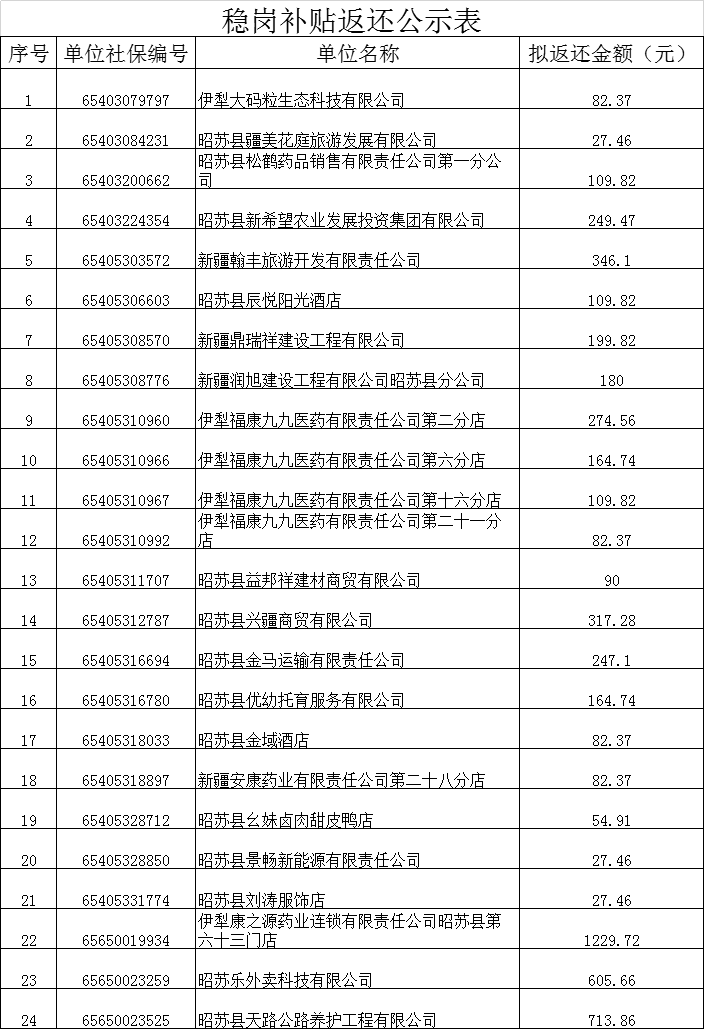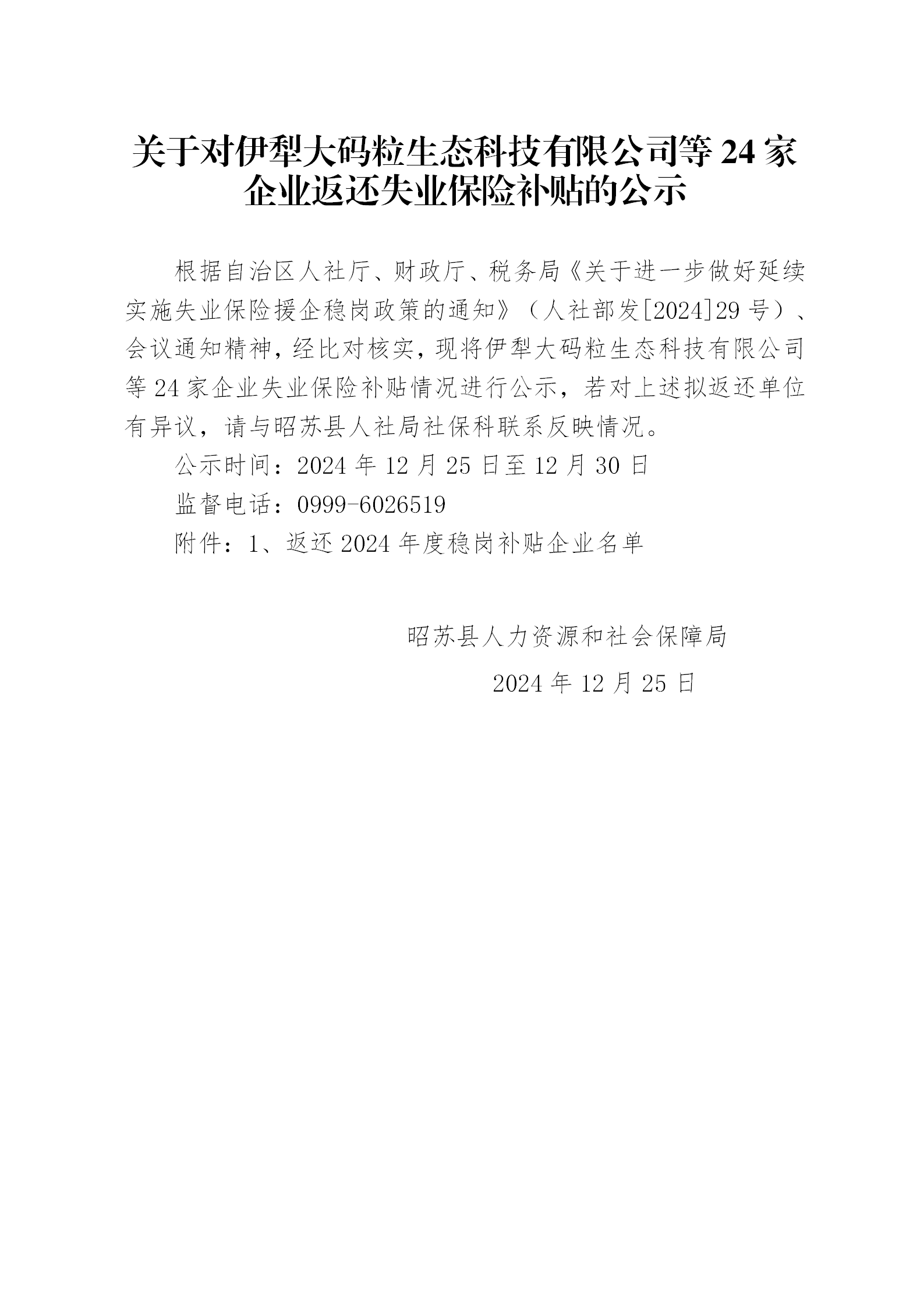 关于对伊犁大码粒生态科技有限公司等24家企业返还失业保险补贴的公示